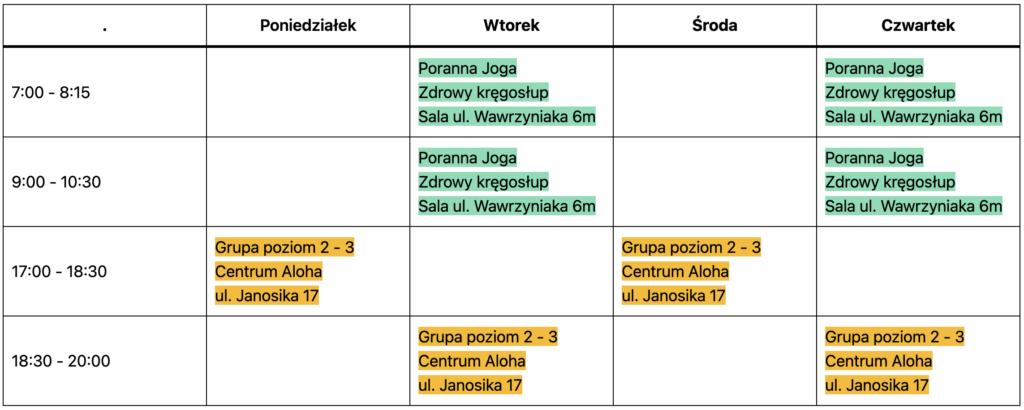 7:00 – 8:15 | Poranna Joga Zdrowy kręgosłup Sala ul. Wawrzyniaka 6m | Poranna Joga Zdrowy kręgosłup Sala ul. Wawrzyniaka 6m | ||